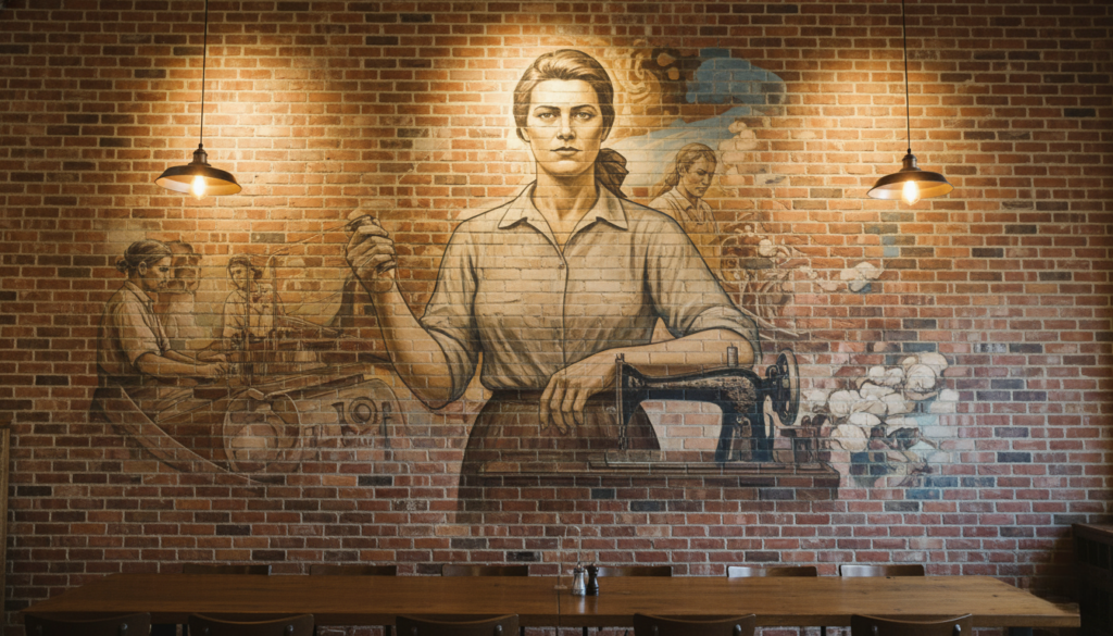 The restaurant honors textile workers through their artwork which displays a beautiful image of Nellie who wears cotton in her hair. The restaurant shows deep honor for local historical events which connect with people who value community pride and dedication to hard work.