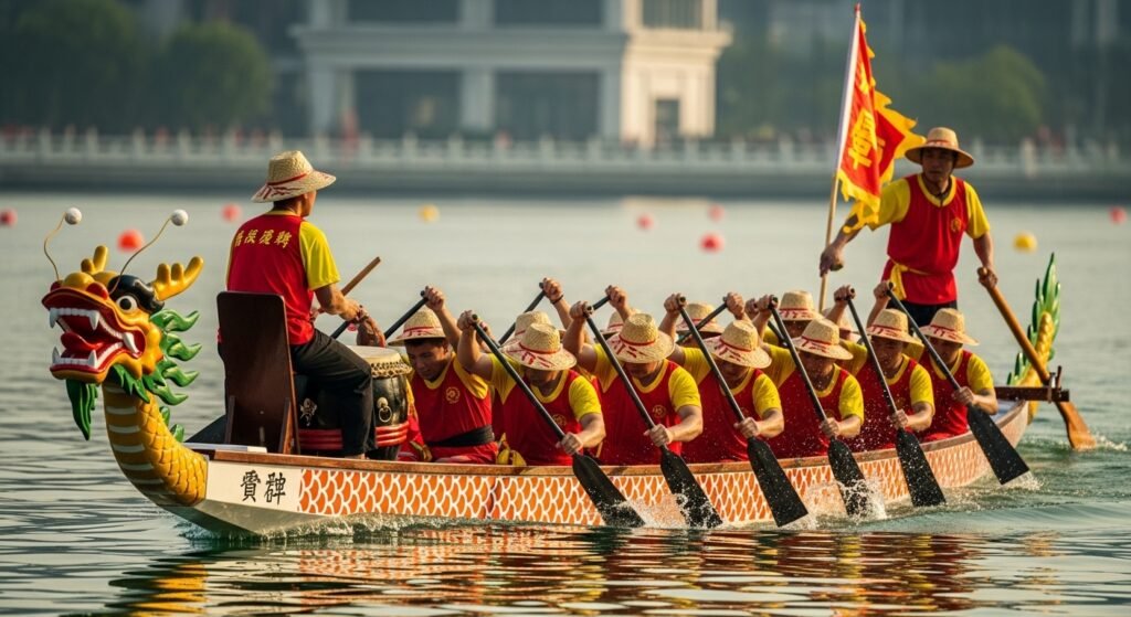 The ancient custom honors the poet Qu Yuan through its display of long narrow boats which show decorative dragon heads and tails and the paddling teams need to coordinate their movements with the drumming rhythm because the success of their race depends entirely on their ability to work together as a team.