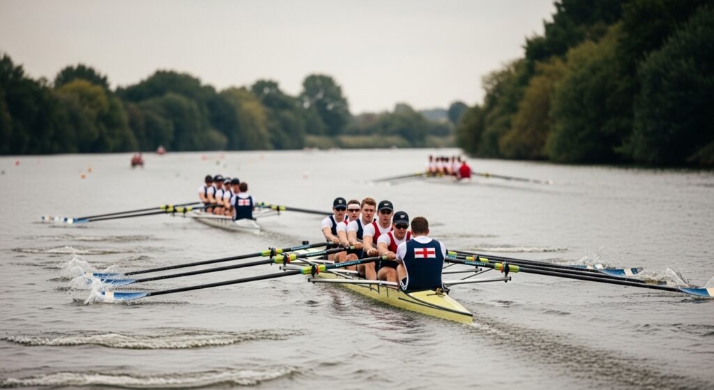 The collegiate rowing championship for Oxford and Cambridge universities takes place on the River Thames and this competition requires eight rowers- to endure difficult conditions while they navigate the water for four miles during a national holiday.