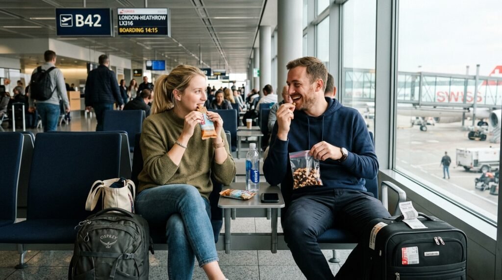 You should always bring a small reserve of protein-rich snacks. When blood sugar levels drop during travel, it creates arguments between travelers, so having snacks ready helps maintain a positive atmosphere during extended waiting periods.