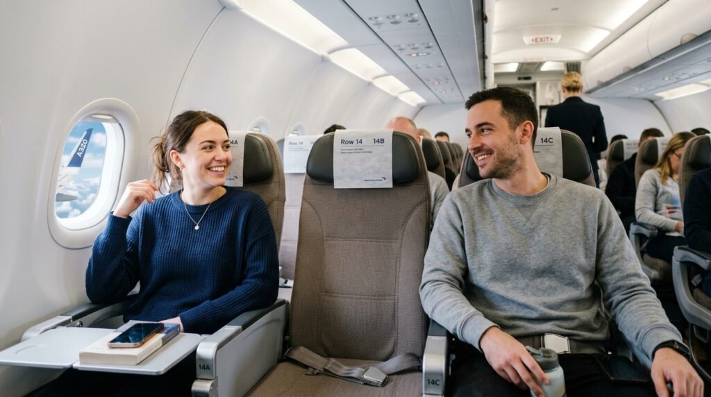 You should select the window seat and the aisle seat when you fly on an airplane which has three seats available and the seat selection process leaves middle seats as the last option, which means you will most likely receive an empty seat next to you for additional distance.