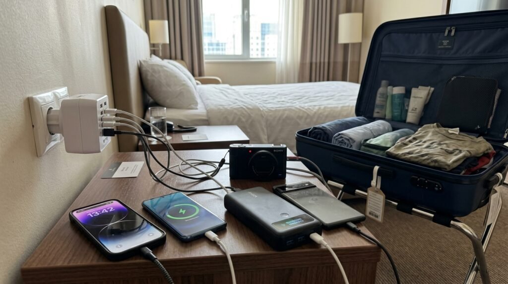 You will find that hotel rooms provide insufficient charging ports. The universal adapter enables multiple charging from a single outlet, which allows you to power various devices, including your phones and cameras and watches, simultaneously.