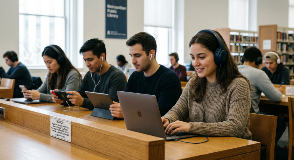 The rule applies to all devices which produce audio including phones, tablets, laptops and handheld gaming consoles. The audio output requires headphones whenever the device produces any sound.