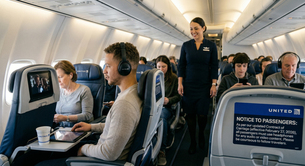 United added this rule to its official “Contract of Carriage” on February 27, 2026. The legal agreement requires ticket buyers to use headphones for all audio and video content which they choose to listen to.