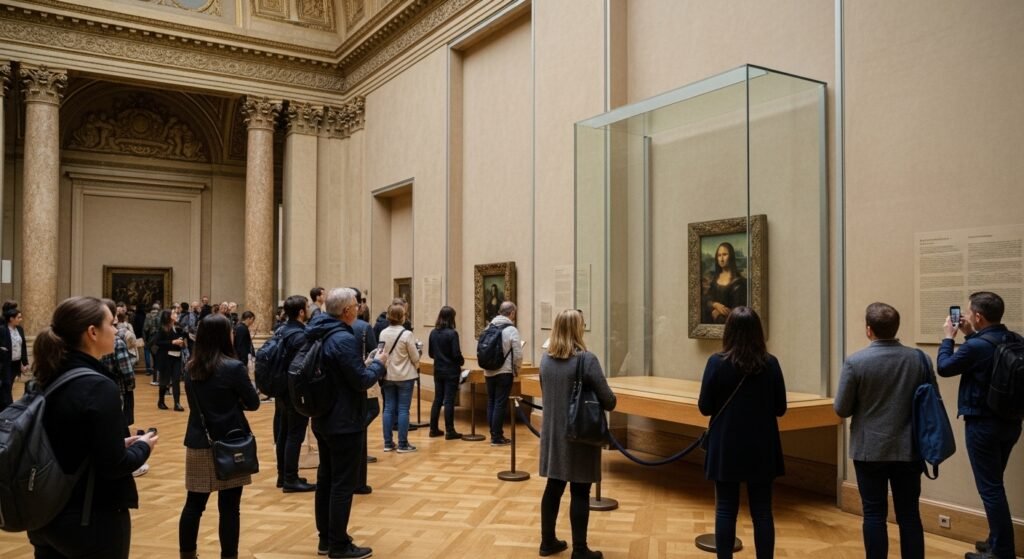 The Parisian art museum which is the largest in the world offers visitors access to its various exhibition areas for exploration. The system enables users to see the Mona Lisa and all other famous artworks at their highest zoom level while they navigate through the architectural features of the historic royal palace.