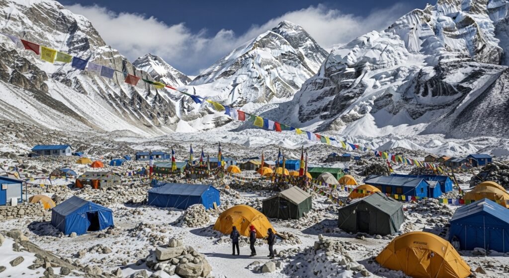 The snowy trails lead to the peak which stands as the highest mountain on Earth. The virtual trek provides users with the opportunity to view the Himalayan mountains which contain sharp peaks and colorful prayer flags at the well-known base camp.