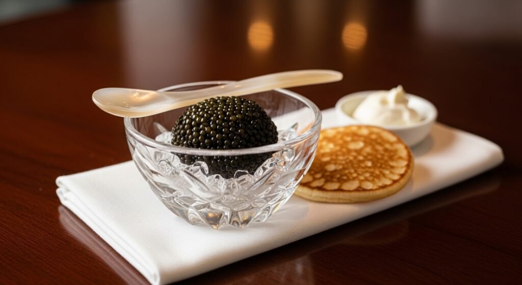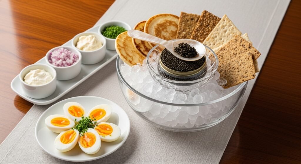 Caviar contains natural saltiness which leads to its traditional serving with “bland” foods that create taste balance. People commonly choose blinis, which are small pancakes, along with unsalted crackers and hard-boiled eggs as their preferred snacks.