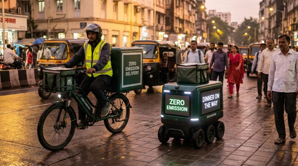 The delivery services show an environmentally friendly approach through their operations. Major food delivery applications prefer “Green Routes,” which use electric bikes and autonomous sidewalk robots for dinner deliveries because this method keeps all delivery emissions at zero.