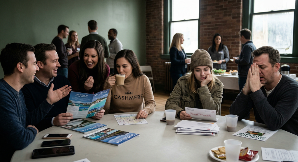 The conversation about expensive vacations creates an immediate barrier when people who face challenges with their rent expenses attend. Wealth gaps create a situation where people choose their conversation topics and social activities, which results in a complete disconnection from the room atmosphere.