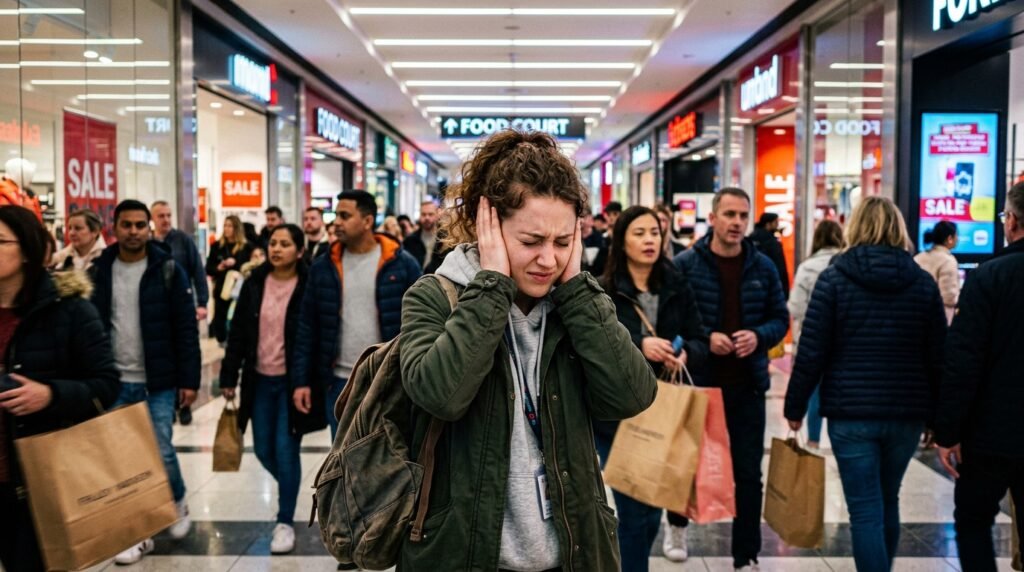 People can become distracted by the particular combination of lighting and sound and a neurodivergent person might feel they “don’t belong” in a crowded, neon-lit mall because their nervous system is overwhelmed, even if they like the stores.