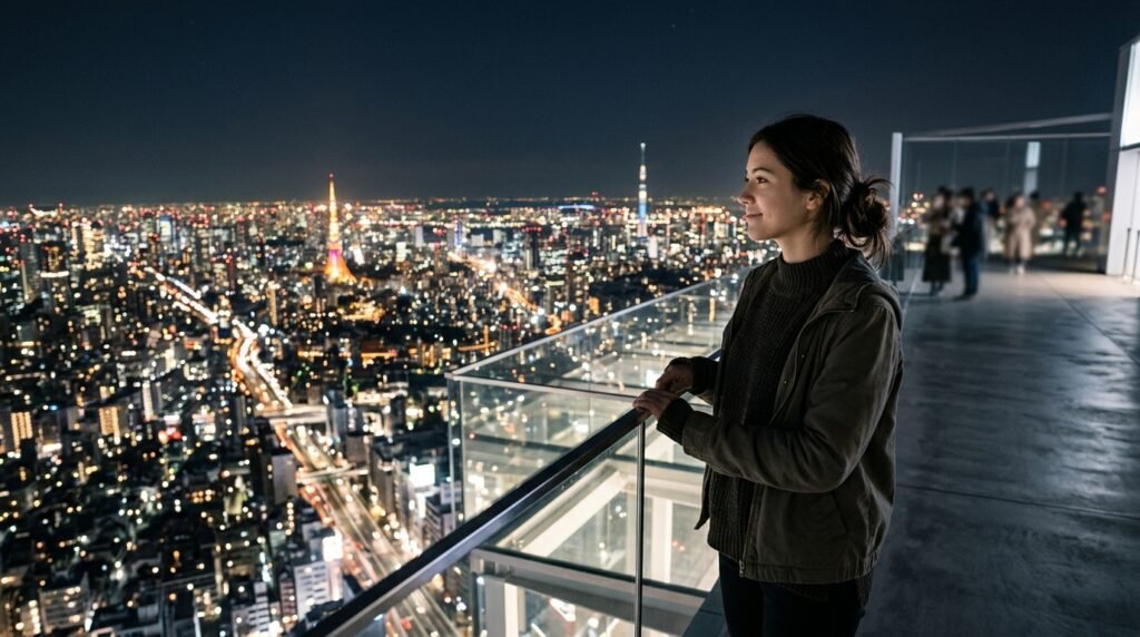 Tokyo provides various observation decks which people can visit without spending much money. The view at this point shows how far city lights extend to all sides because it opens up toward the largest urban area in the world.
