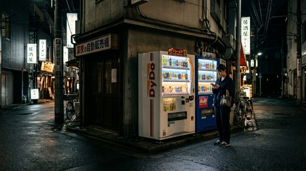 Japanese vending machines function as colorful landmarks which create lighted areas during nighttime. Finding a hot can of coffee in a secluded, moonlit park is a simple pleasure that defines the quiet, technological convenience of a Tokyo night.