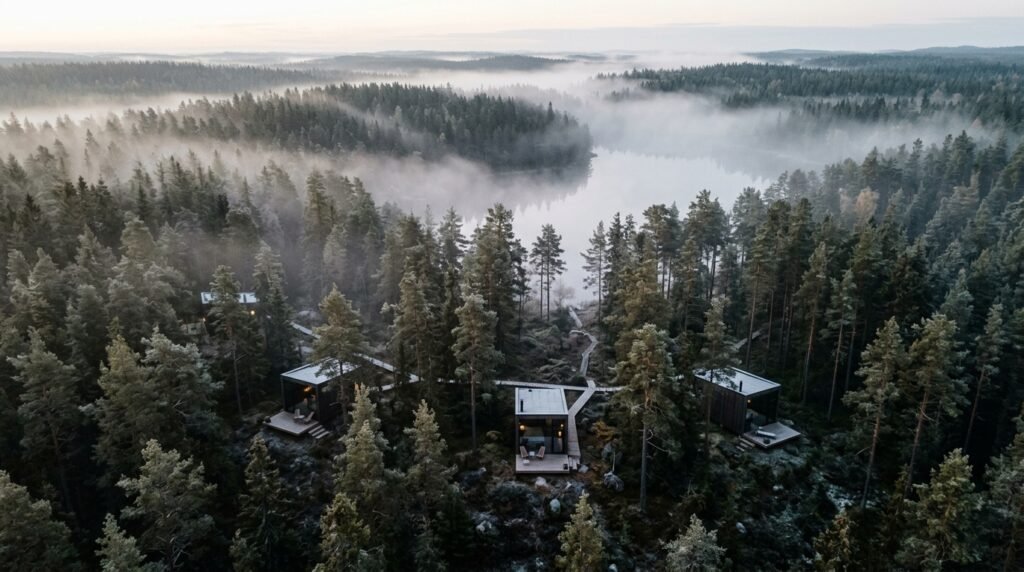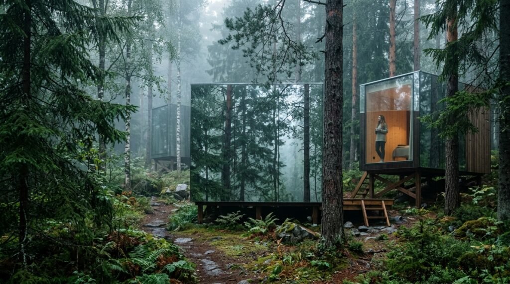 The retreats use “Mirror Cabins” that reflect the forest, making the buildings invisible to wildlife. This design makes guests feel like they are suspended above the ground, which reduces their cortisol levels through complete environmental connection.